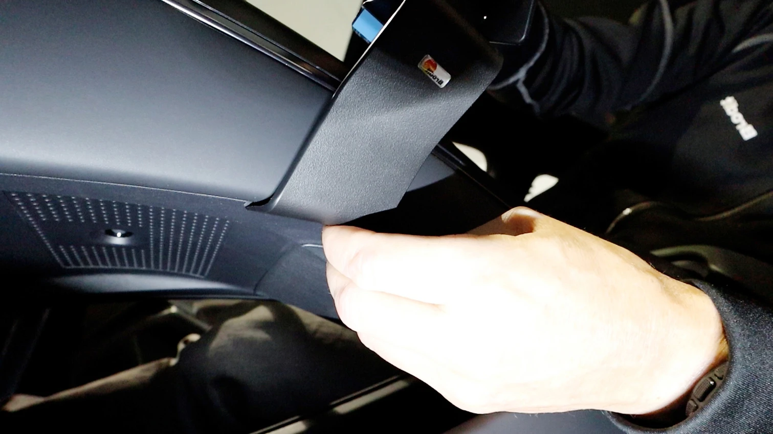 Use the enclosed alcohol pad to clean the area where the mount will be installed. Peel off the adhesive tape cover. Press the lower edge of the mount into the gap on the center console sidewall.