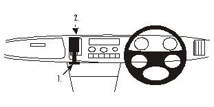 Clean the surface at pos 1 with the enclosed alcohol pad. Press the grooved edge on the lower part of the ProClip into the gap between the center console and the dashboard at pos. 1.