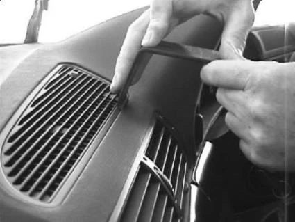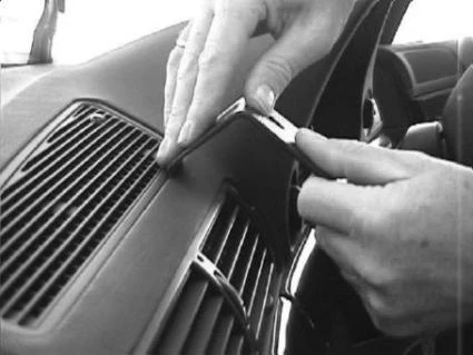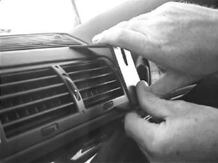 Hold the ProClip so the face is in a horizontal position and press the curved edge on the upper part of the ProClip into the gap between the padded dashboard and the air vent frame.