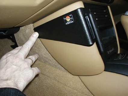 Press firmly forward on the left side of the ProClip so the curved edge on the left side of the ProClip hooks behind the console edge by the carpet.