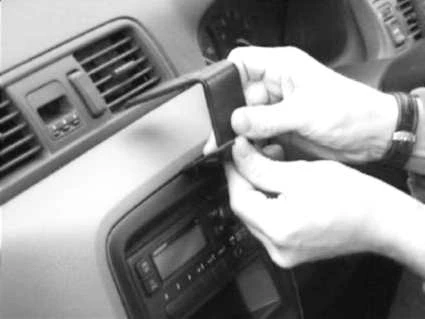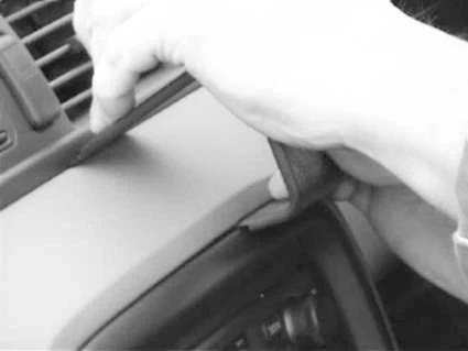 Press the thin end of the enclosed gap opener into the gap between the padded ledge and the center console frame. Peel off the cover of the adhesive tape on the ProClip.