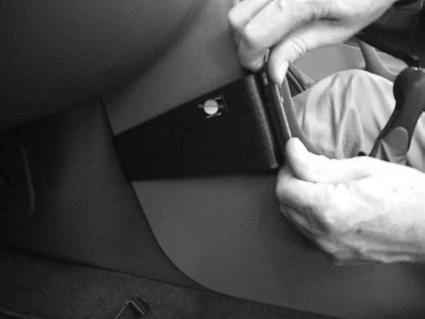 Press forward on the left side of the ProClip so the angled edge on the left side snaps/hooks over the edge in the console wall. Feel to make sure the angled edge is hooked all the way over console edge.