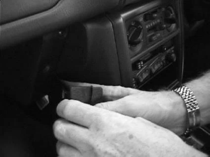 Press/hook the angled edge on the leftt side of the ProClip into the gap between the dashboard and the glove compartment frame and flip the ProClip to the right so the angled edge hooks behind the glove compartment frame.