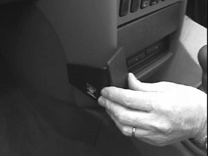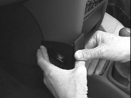 Press the right part of the ProClip into the gap between the center console panel and the padded dashboard at pos 1