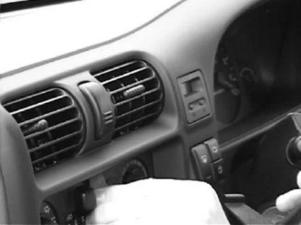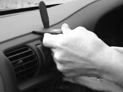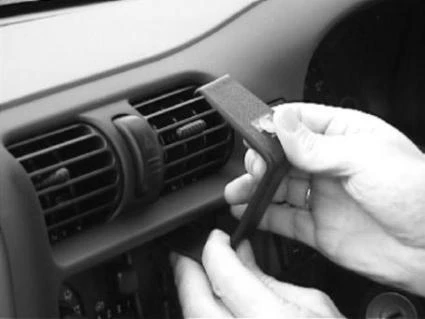 Press the thin end of the enclosed gap opener into the gap between the air vent panel frame and the padded dashboard at pos. X. to widen the gap. Slide the gap opener to pos. 2. Clean the surface at pos. 2 with the enclosed alcohol pad. Peel off the cover of the adhesive tape on the ProClip.