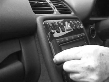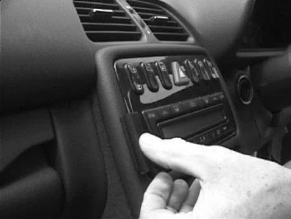 Push forward on the right side of Part 1. towards the padded console edge, so the angled edge of Part 1. hooks under/behind the panel frame and the adhesive sticks to the console edge.