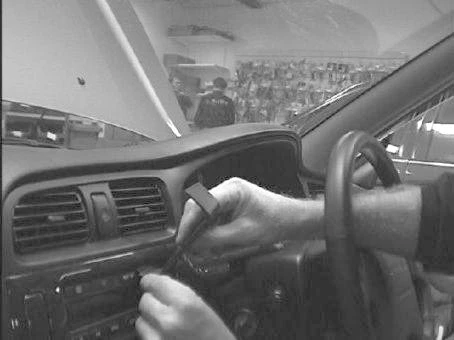 Clean the surface by the stereo and the surrounding panel frame with the enclosed alcohol pad. Peel off the cover of the adhesive tape on the ProClip. Place the angled edge on the lower part of the ProClip by the stereo and the surrounding panel frame.