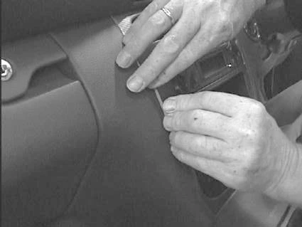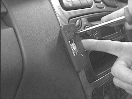 Press the thin end of the enclosed gap opener into the gap between the center console panel and the console edge, to widen it. Peel off the cover of the adhesive tape on Part 1 and place the thin angled edge into the gap below the gap opener.