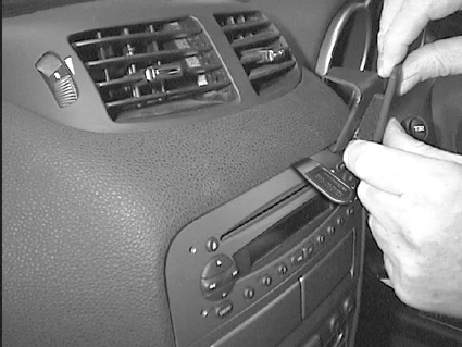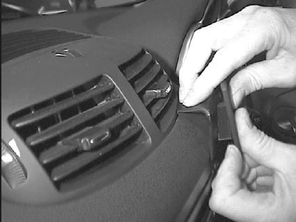 Press the thin end of the enclosed gap opener into the gap between the control panel and the dashboard, to widen the gap. Peel off the cover of the adhesive tape on the ProClip. Press the lower part of the ProClip, with adhesive tape, into the gap next to the gap opener. Pull out the gap opener.