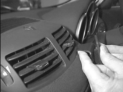 Hook the angled edge on the upper part of the ProClip into the gap between the panel sourrounding the air vents and the dashboard.
