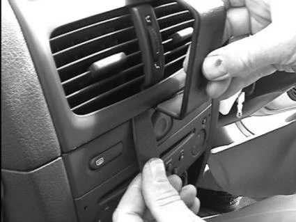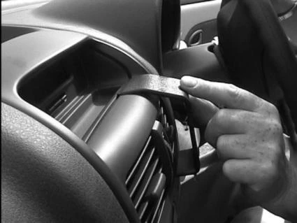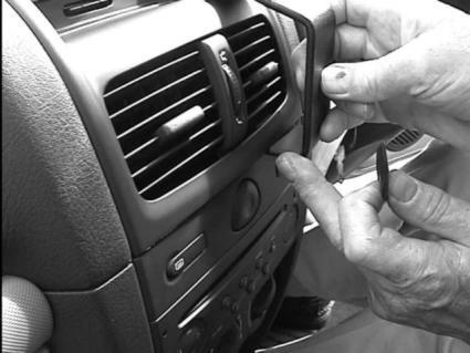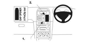 Press the thin end of the enclosed gap opener into the gap between the frame surrounding the air vents and the control panel. Peel off the cover of the adhesive tape on the ProClip. Press forward/downward on the gap opener so the gap widens. Press the grooved lower part of the ProClip into the gap next to the gap opener.