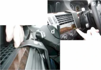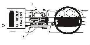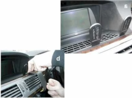 a) Press the thin ends of the two enclosed gap openers into the gap between the dashboard ledge and the air vent frame to widen the gap. (The air vent frame may "pop up" a little. The distance between the gap openers has to be wider than the width of the ProClip.) b) Peel off the cover of the adhesive tape on the ProClip. Press the thin angled edge on the upper part of the ProClip into the gap between the gap openers - don't press it all the way in so the adhesive tape attaches to the ledge yet.