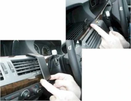 a) Press upwards on the lower part of the ProClip so the angled edge goes all the way in behind the wood grain panel. b) Remove the left gap opener by the upper part of the ProClip and press down on the air vent panel so it "pops" back into place.