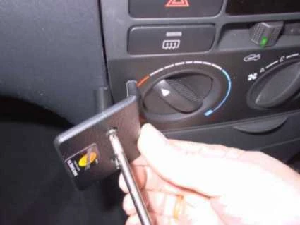 Peel off the cover of the adhesive tape on Part 1. Press Part 1 into the gap between the gap openers. Press to the left on Part 1, away from the steering wheel, so the angled edge hooks under/behind the control panel and the adhesive attaches to the dashboard. Pull out the gap openers.