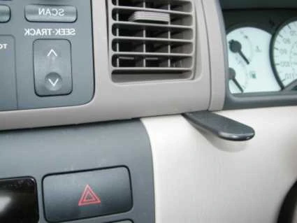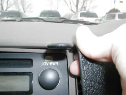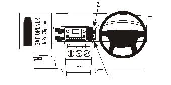 Press the thin end of the enclosed gap opener into the gap between the panel frame surrounding the stereo and the padded dashboard to widen the gap. Press the grooved edge on the upper part of the ProClip into the gap next to the gap opener. Note: Start by pressing forward on the upper left corner of the ProClip, and then follow through by moving your pressure over to the right corner of the ProClip. Press until you see or hear/feel it snap into place. Pull out the gap opener.