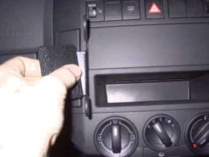 Press the thin end of the enclosed gap openers into the gap between the stereo/coin shelf and the surrounding frame to widen the gap. Peel off the adhesive tape covers on the ProClip. Press the right part of the ProClip into the gap between the gap openers