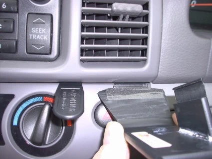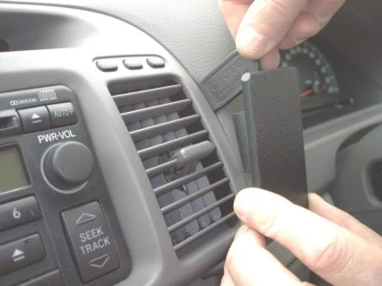 Press the thin end of the enclosed gap opener into the gap between the air vent panel frame and the climate control panel frame, to widen the gap. Press the curved edge on the lower part of the ProClip into the gap next to the gap opener.