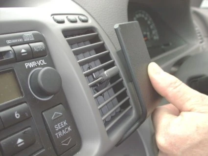 Pull out the gap opener, flip the ProClip upwards towards the air vent, and press the gap opener into the gap between the air vent frame and the padded dashboard to widen the gap. Place the lower corner of the vertical grooved edge on the ProClip towards the gap.