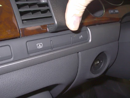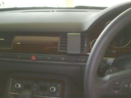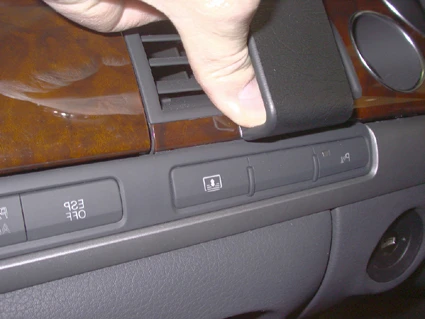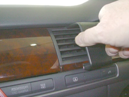 Peel off the cover of the adhesive tape on the ProClip. Press the grooved edge into the gap between the air vent frame and the dashboard overhang. Press until you see or hear/feel it snaps into place.