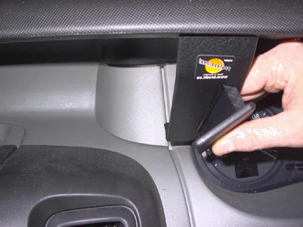 Peel off the cover of the adhesive tape on the ProClip. Place the ProClip to the right of the right air vent, on the left side of the steering wheel. Hold the ProClip so the upper part is pointing towards you. Press the curved edge on the upper part of the ProClip upwards/towards you into the gap in the dashboard, under the dashboard ledge. Pull the lower part of the ProClip towards you, away from the dashboard, so the curved upper edge hooks into the gap.