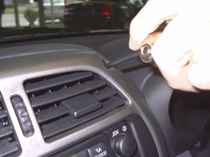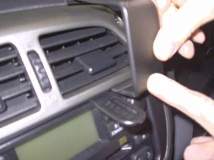 Press the thin end of the enclosed gap opener into the gap between the frame surrounding the air vent and the stereo, to widen the gap. Peel off the adhesive tape covers on the ProClip. Press the lower part of the ProClip into the gap next to the gap opener. Pull out the gap opener.