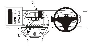Press forwards on the upper part of the ProClip so the angled edge hooks into the gap between the frame surrounding the control panel and the dashboard. Press the gap opener into the gap next to the ProClip and prize carfully so the gap is widened. Press downwards on top of the ProClip so it goes all the way into the gap. Pull out the gap opener. Retighten the screws.