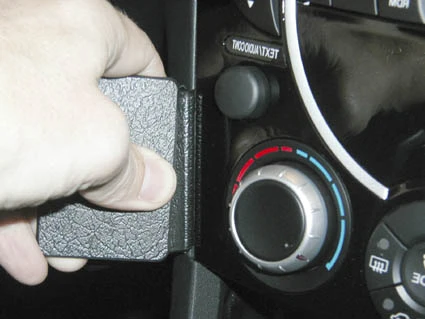 Peel off the cover of the adhesive tape on the ProClip. Press the angled edge on the right side of the ProClip into the gap between the center console panel frame and the console edge.
