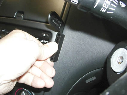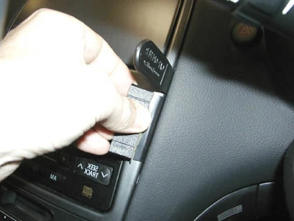 Press to the right on Part 1, towards steering wheel, so the angled edge hooks behind the frame surrounding the control panel and the adhesive tape attaches. Pull out the gap opener.