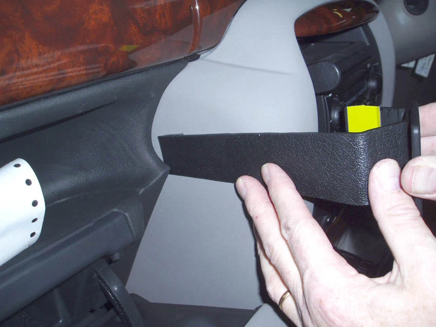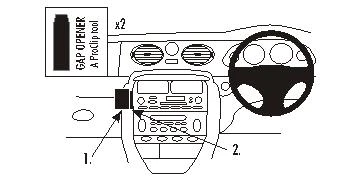 Press the thin ends of the enclosed gap openers into the gap between the control panel and the surrounding frame, to widen the gap. Place the gap openers about 10 cm apart. Peel off the adhesive tape covers on the ProClip. Place the ProClip over the frame surrounding the control panel so the right part is between the gap openers and the long left part goes into the gap between the glove compartment and the frame surrounding the control panel.