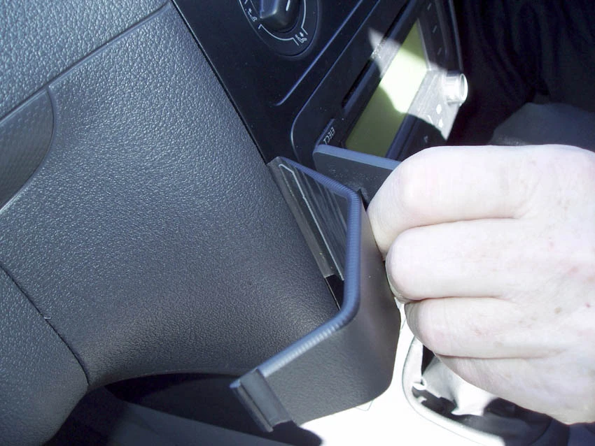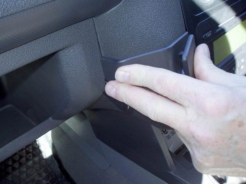 Peel off the adhesive tape covers on the ProClip. Press the curved edge on the right part of the ProClip into the gap between the frame surrounding the control panel and the dashboard.