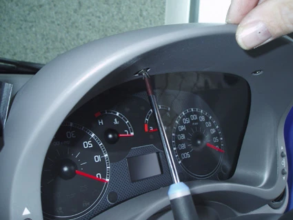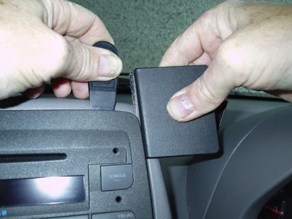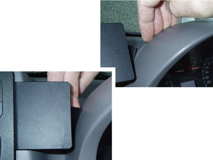Loosen the screw to the left under the dashboard overhang above the instrument window. Peel off the cover of the adhesive tape on the ProClip.