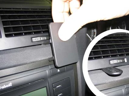 Press the thin end of the enclosed gap opener into the gap between the frame surrounding the air vent and the dashboard, to widen the gap. Peel off the cover of the adhesive tape on the ProClip. Press the upper part of the ProClip, with adhesive tape, into the gap next the gap opener. Pull out the gap opener.