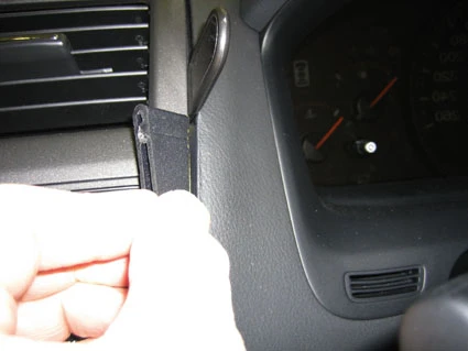 Press the thin ends of the enclosed gap openers into the gap between the air vent frame and the dashboard, to widen the gap. Place the gap openers about 10 cm apart. Peel off the cover of the adhesive tape on Part 1. Press the angled edge on Part 1 into the gap between the gap openers.