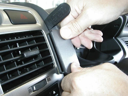 Press the thin ends of the enclosed gap openers into the gap between the air vent frame and the dashboard, to widen the gap. Place the gap openers about 10 cm apart. Peel off the adhesive tape covers on the ProClip.