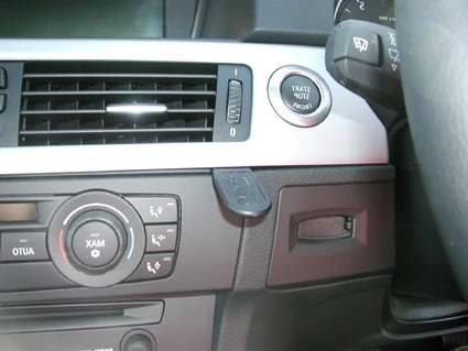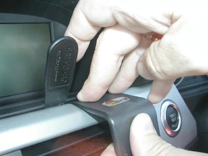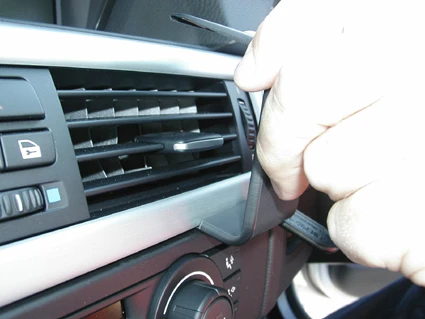 Press the gap opener into the gap between aluminum trim and the navigation screen panel frame. Press forward on the upper part of the ProClip and at the same time press down on top of the ProClip so the angled edge snaps into the gap next to the gap opener. Pull out the gap opener.