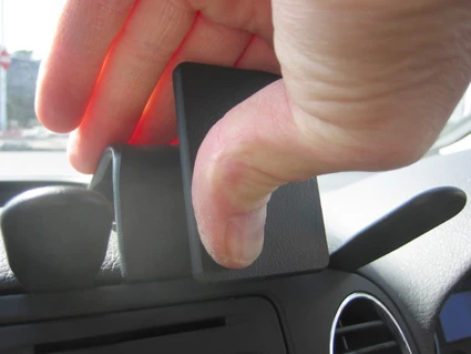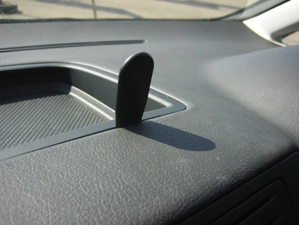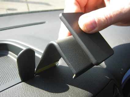 Press the thin end of one of the enclosed gap openers into the gap between the frame surrounding the coin compartment and the dashboard, to widen the gap. Peel off the adhesive tape covers on the ProClip.