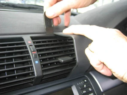 Press the thin end of the enclosed gap opener into the gap between the air vent and the surrounding frame to widen the gap. Peel off the adhesive tape cover on the ProClip. Press the grooved edge on the lower part of the ProClip into the gap next to the gap opener. Pull out the gap opener.