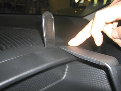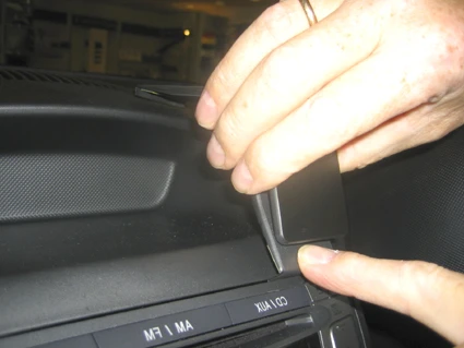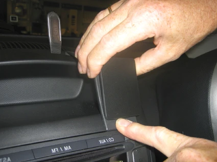 Press the thin end of the enclosed gap opener into the gap between the control panel and the dashboard, to widen the gap. Peel off the adhesive tape covers on the ProClip. Press the angled edge on the lower part of the ProClip into the gap between the stereo and the surrounding panel.
