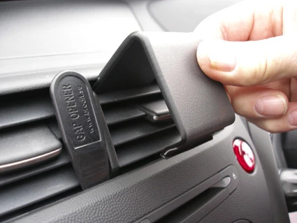Press the thin end of the enclosed gap opener into the gap between the air vent and the surrounding frame, to widen the gap. Use the enclsed alcohol pad to clean the surface where the ProClip is to be installed. Peel off the adhesive tape covers on the ProClip. Hook the upper part of the ProClip into the upper part of the air vent.