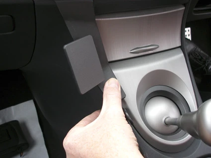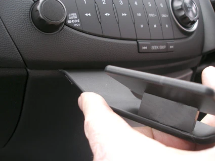 Press the angled edge on the upper part of the ProClip into the gap between the frame surrounding the control panel and the dashboard. Flip the ProClip downwards so the angled upper edge hooks behind the frame surrounding the control panel.