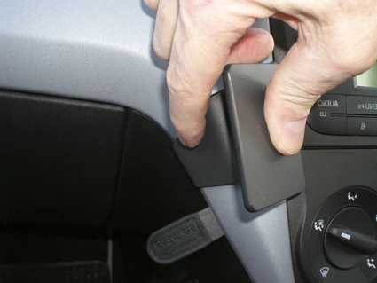 Press the curved edge on the right part of the ProClip into the gap below the gap opener. Press the ProClip leftwards/forwards so the curved right edge hooks behind the control panel. Pull out the gap opener.
