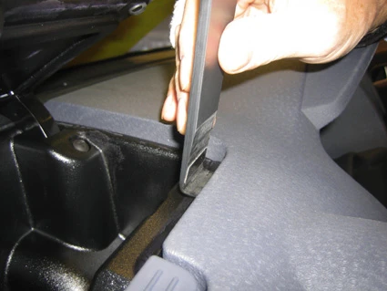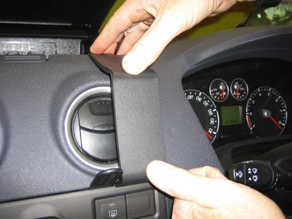 Press the curved edge on the upper part of the ProClip into the gap between the coin compartment and the dashboard. Flip the ProClip downwards/forwards so the upper curved edge hooks under the coin compartment.