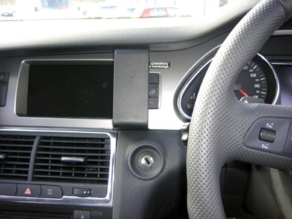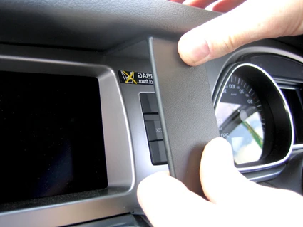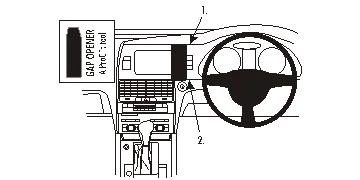 Press the gap opener into the gap between the frame surrounding the display and the dashboard. Press the gooved edge on the lower part of the ProClip into the gap next to the gap opener. Press until you hear/feel it snaps into place. Pull out the gap opener.