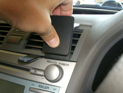 Press the thin end of both gap openers (on each side of the ProClip) into the gap between the padded dashboard and the air vent panel frame, to widen the gap. Press forward with your thumb on the upper part of the ProClip face plate, and down on the top right side of the ProClip with your long finger or index finger so the angled edge goes into the gap next to the gap opener. Press until you see or hear/feel it snaps into place.