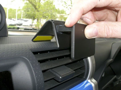 Peel off the cover of adhesive tape on the ProClip. Hook the angled edge on the lower part of the ProClip into the upper part of the air vent. 2 och 3. Place your thumb onto the top part of the ProClip. Press firmly forward on the ProClip so the angled edge goes into the gap in the dashboard. Press until you see or hear/feel it snaps into place.