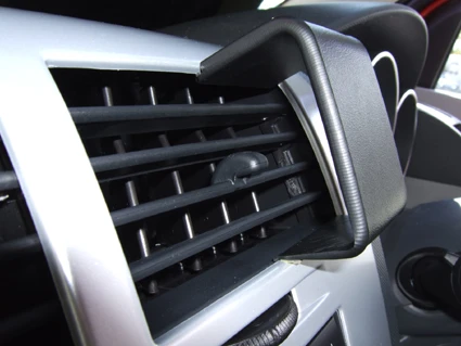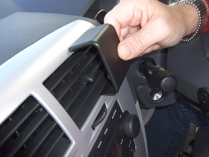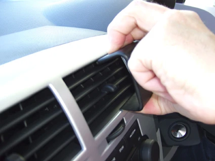Peel off the cover of adhesive tape on the ProClip. Press the angled edge on the lower part of the ProClip into the gap between the lower part of the air vent and the surrounding panel frame.
