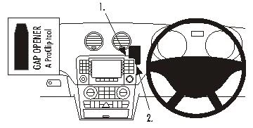 Press firmly forward on the lower rightt side of the ProClip so the grooved edge goes into the gap between the center console panel frame and the padded part of the dashboard. Press/wiggle on the top and bottom of the mount until you see or hear/feel it snaps into place. Pull out the gap opener.