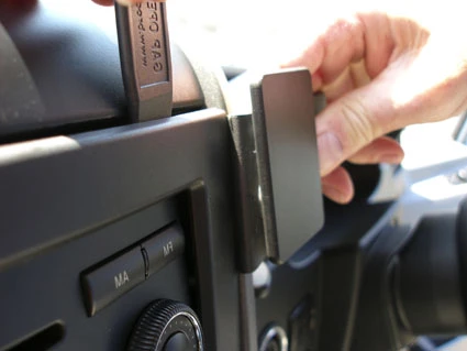 Use the enclosed alcohol pad to clean the area where the ProClip is to be installed. Press the thin end of the enclosed gap opener into the gap between the frame surrounding the control panel and the dashboard and prize the frame surrounding the control panel loose slightly. Peel off the adhesive tape covers on the ProClip. Place the curved edge on the left part of the ProClip into the gap between the frame surrounding the control panel and the frame surrounding the air vent.