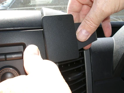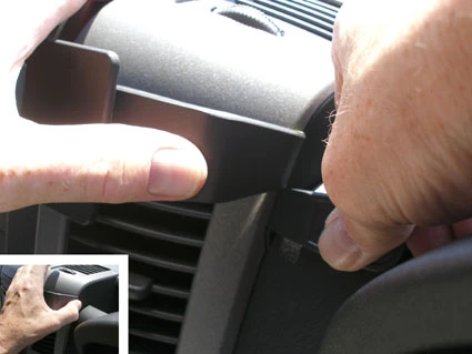 Press the gap opener into the gap between the frame surrounding the air vent and the dashboard and press forward on the gap opener so the gap is widened. In the same time press forward on the right side of the ProClip so the angled edge hooks into the gap above the gap opener. Pull out the gap opener. Press the right part of the ProClip toward the gap so the angled edge goes all the way into the gap.