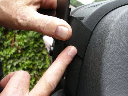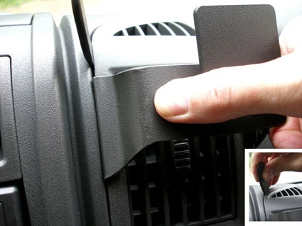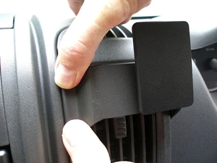 Press the thin end of the enclosed gap opener into the gap between the frame surrounding th air vent and the dashboard, to widen the gap. Press the gap opener into the gap in the upper corner of the air vent and slide it downwards, still in the gap, into the position shown in the picture. Press forward on the left side of the ProClip so the angled edge hooks into the gap below the gap opener. Pull out the gap opener.